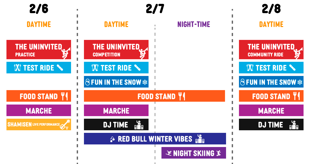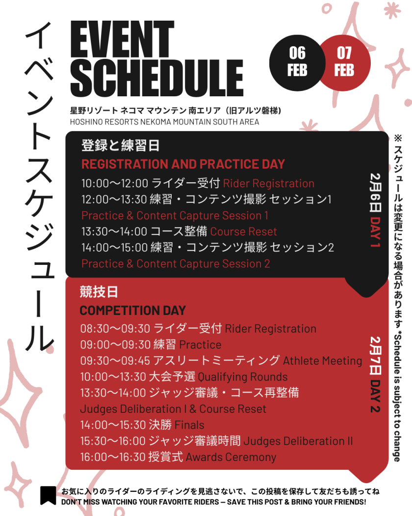 | 開催時間 | 2/6 公開練習 10:00~12:00 受付 12:00~13:30 練習・撮影セッション 14:00~15:00 練習・撮影セッション 2/7 8:30~9:30 受付 9:00~9:30 練習 10:00~13:30 大会予選 14:00~15:00 決勝 16:00~授賞式 2/8 10:00~11:00 受付 11:00~11:30 紹介&ウォームアップ 11:30~14:30 ライディング&コーチングセッション 14:30~15:30 表彰・選手サイン会 |