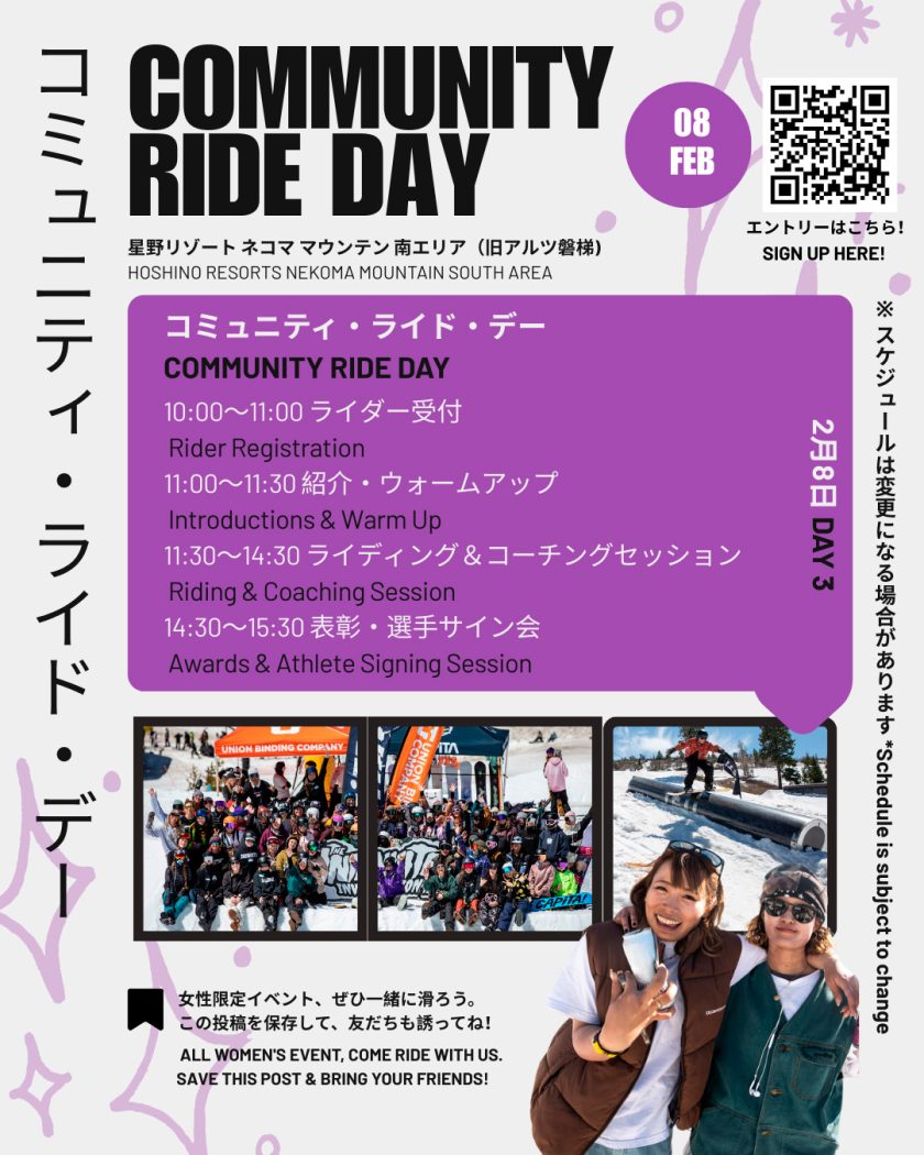 勝敗を競うだけでなく、ライダー同士が互いを応援し、高め合うカルチャーが最大の特徴です。2月7日のコンペティションの翌日はあらゆるレベルのライダーが参加できる、コミュニティライドデーとしてコースを開放。選手と観客が一体となる祝祭の空間となります。(事前要申込)