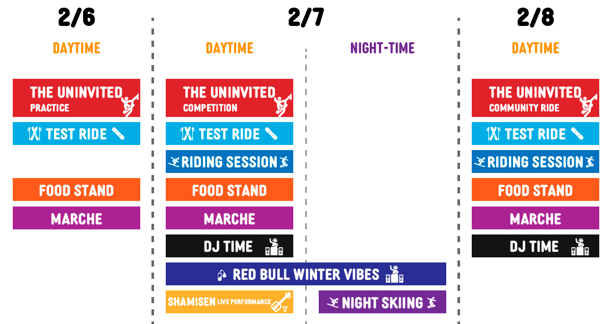 勝敗を競うだけでなく、ライダー同士が互いを応援し、高め合うカルチャーが最大の特徴です。2月7日のコンペティションの翌日はあらゆるレベルのライダーが参加できる、コミュニティライドデーとしてコースを開放。選手と観客が一体となる祝祭の空間となります。(事前要申込)